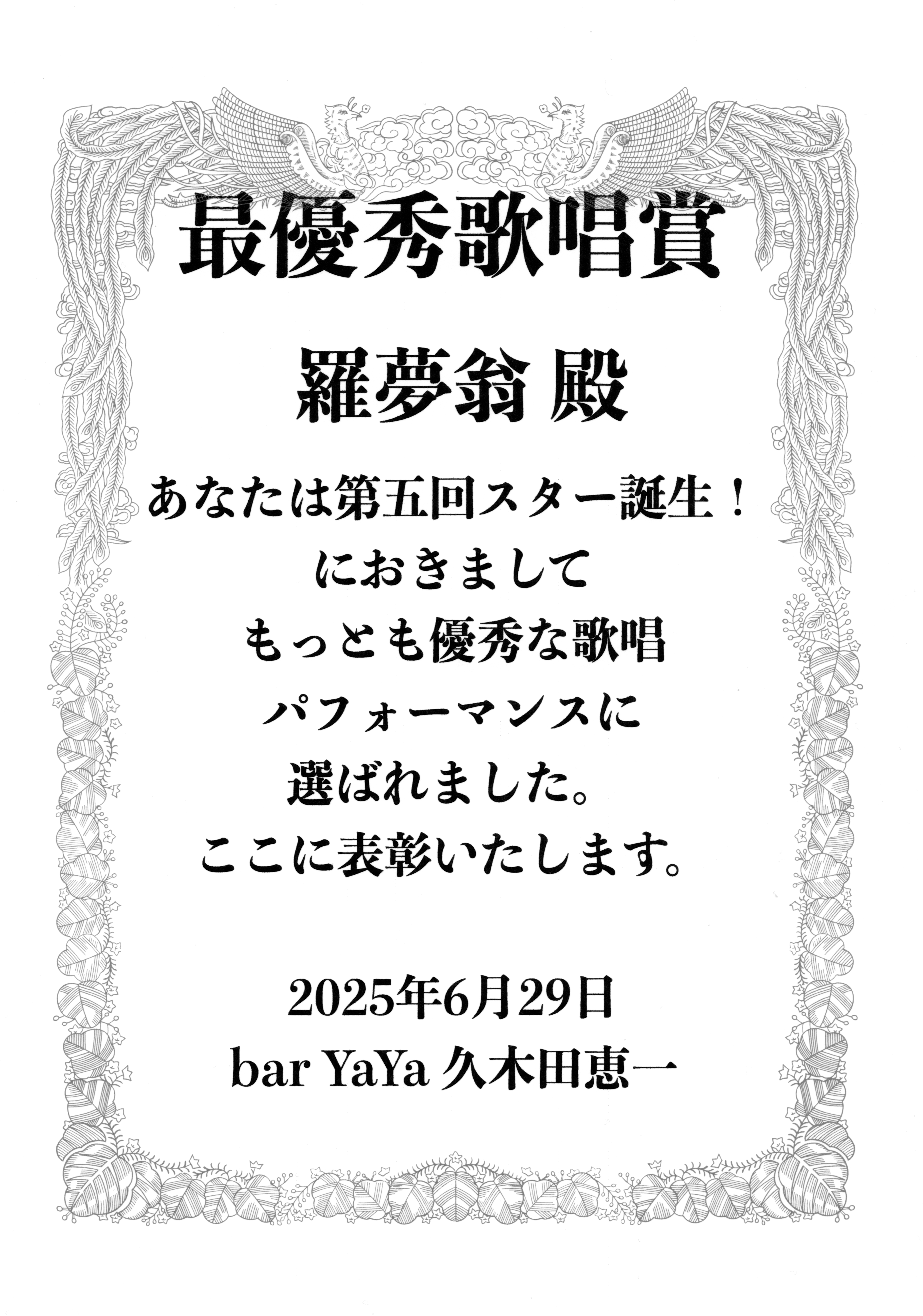 恵比寿YaYa・第5回スター誕生(2025.6.29)最優秀歌唱賞受賞曲